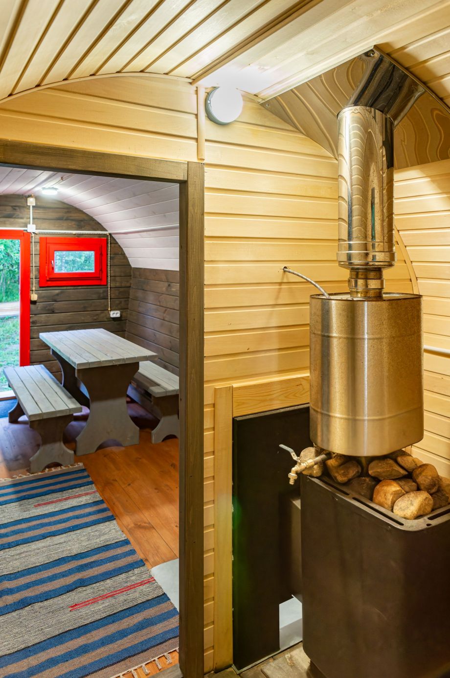 Двухэтажный дом с баней и кухней-гостинной на первом этаже и двумя спальнями на втором.